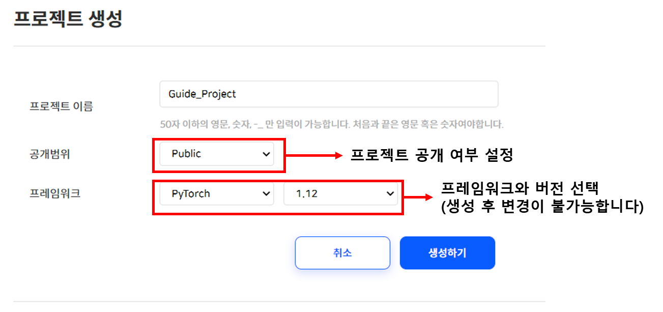 공개범위는 생성 후에도 변경할 수 있으나, 프레임워크 정보는 생성 후 변경할 수 없습니다
