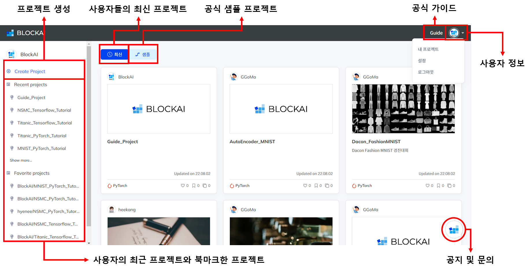 메인 페이지에서는 사용자들이 Public으로 생성한 프로젝트들과 BlockAI의 공식 샘플 프로젝트를 확인허실 수 있습니다.
