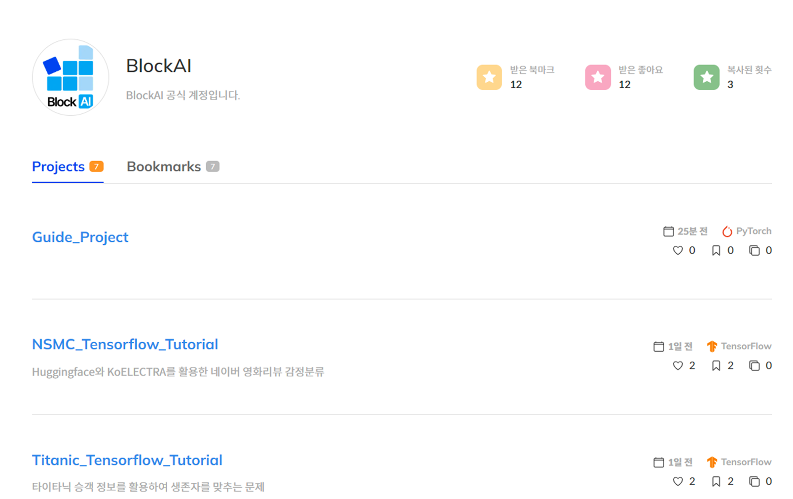메인 페이지에서는 사용자들이 Public으로 생성한 프로젝트들과 BlockAI의 공식 샘플 프로젝트를 확인허실 수 있습니다.