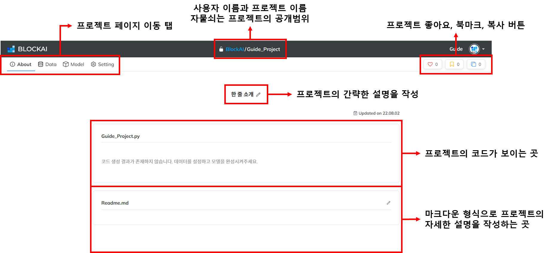 프로젝트의 소개 페이지로 설명을 작성할 수 있으며, 생성된 코드가 있을 경우 코드와 다운로드 버튼이 나타납니다.