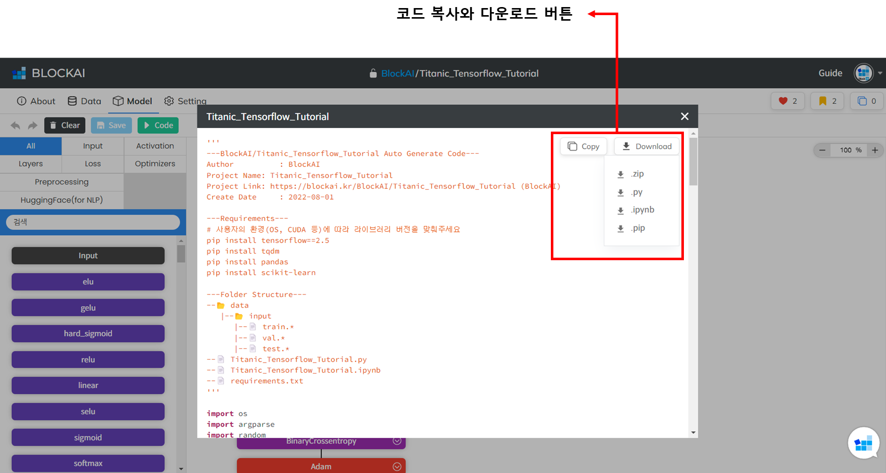 안녕하세요, 블록 조립으로 딥러닝 코드를 생성해주는 BlockAI입니다!
