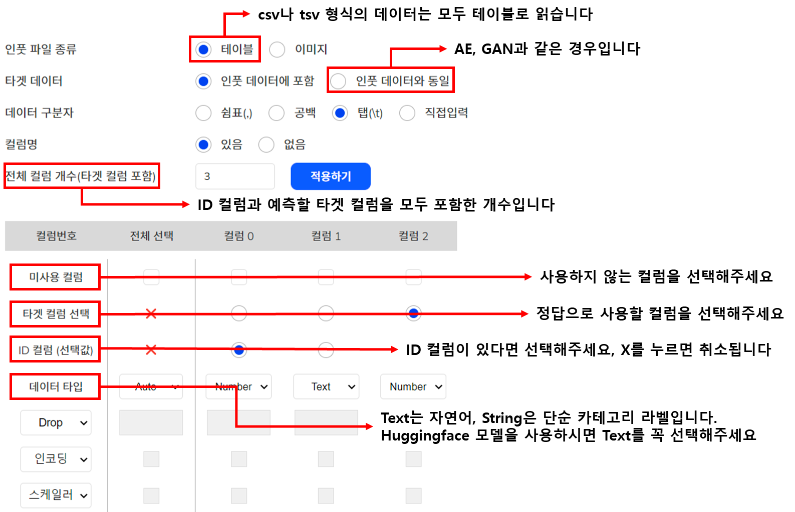 데이터 관리에서는 테이블(엑셀 형식, 텍스트 포함)의 데이터와 이미지 데이터를 나눠서 전처리 정보를 입력합니다.
