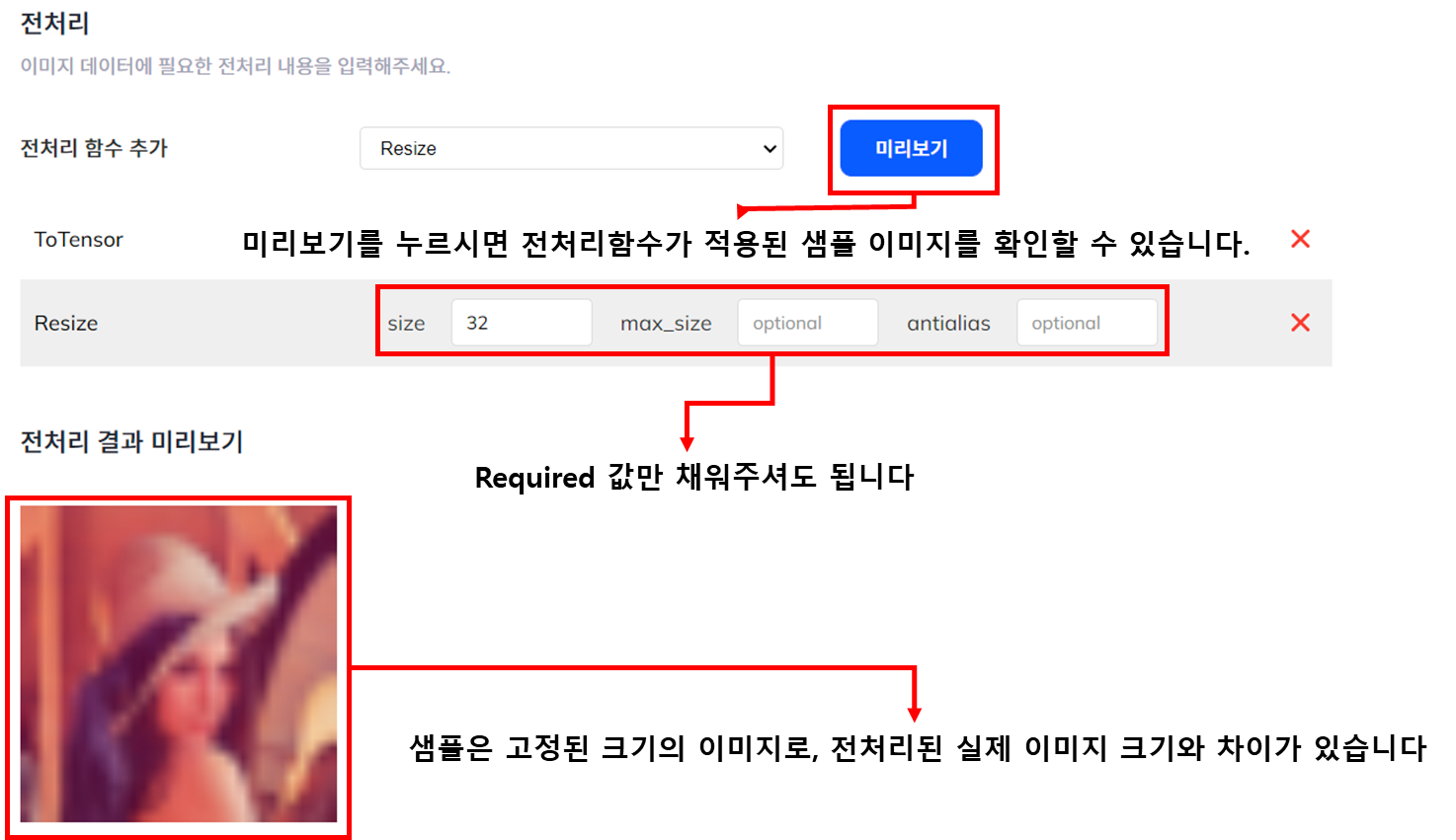 미리보기 이미지는 전처리를 완료한 후 웹에서 고정된 크기의 이미지를 보여줍니다, 실제 이미지와 차이가 있습니다